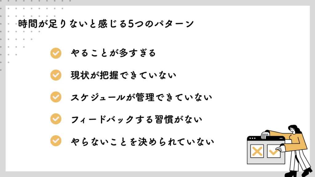 まずは、時間が足りない原因について探っていきましょう。
