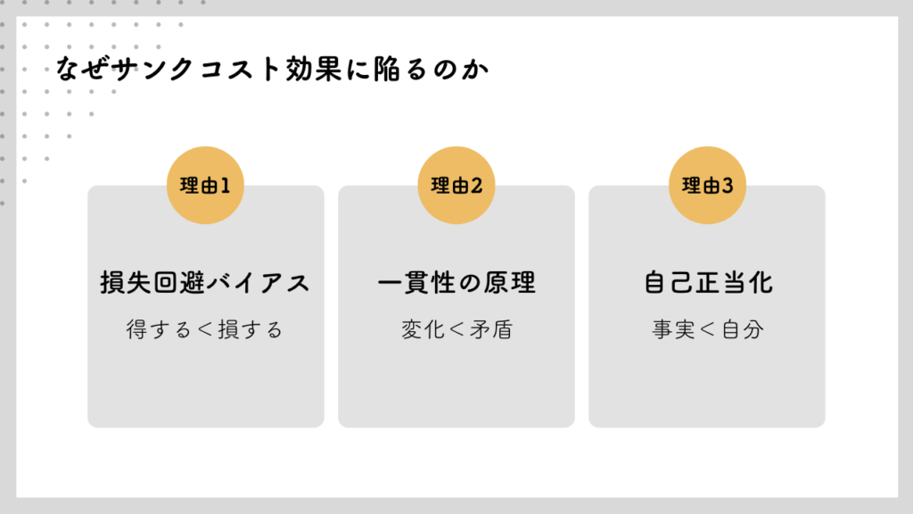 サンクコスト効果が発生する背景には、3つの心理的要因があります。