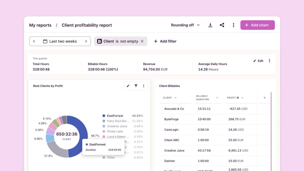 Everhourは、クライアントワーク中心の企業向けに特化したツールです。時間追跡から請求書発行までの一連の流れをスムーズに処理できる点が特徴です。