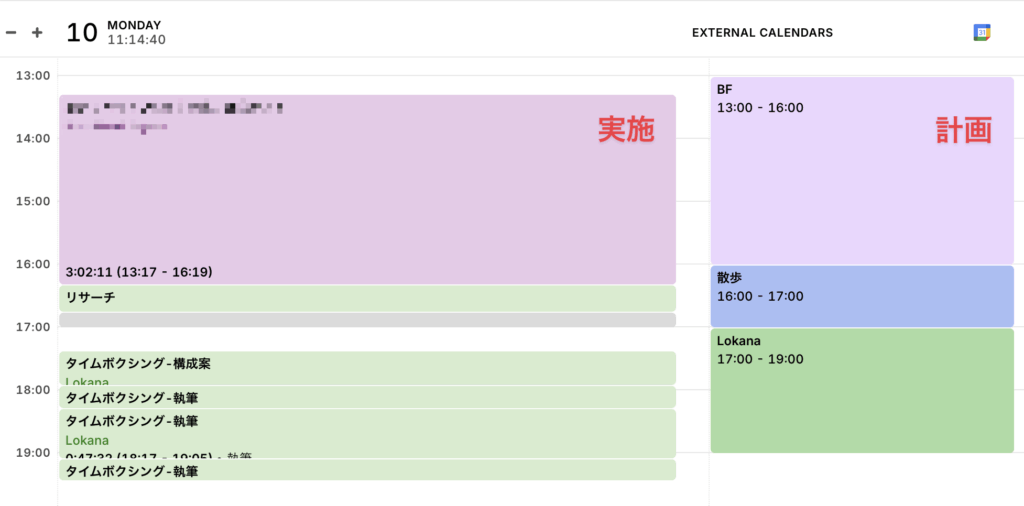 | 例 | 09:00〜11:00:企画書作成 11:00〜12:00:メール返信 | 企画書の構成:40分 企画書の執筆:80分 |